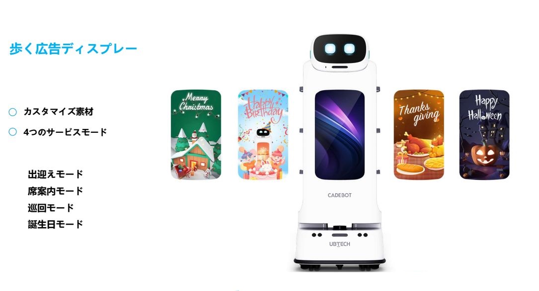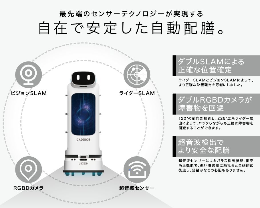 CADEBOT(ケイドボット)は4段の大型トレイでシンプルながら積載量が多いため、配膳・下膳の作業を効率よく行える配膳ロボットです。 複数のセンサーを搭載しているため、走行中に障害物を自動回避し作業を安全に行うことが可能です。 トレイごとに赤外線センサーを搭載しているため、食器の有無を検知して自動的に次の行動を開始します。一度の操作で複数のテーブルに対応することができます。 本体前面に大型ディスプレイを搭載しているので、季節のメニューやデザートの紹介、イベントなどの告知を表示させてお客様にアピールすることが可能です。 【想定される利用場所】 レストラン・高校・ホテル・工場・スーパー